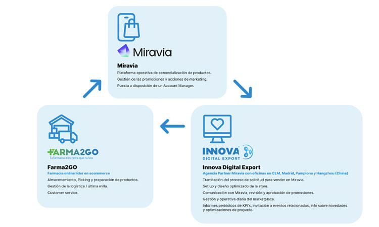 Por un lado, Exportación Digital Innova, como agencia asociada de Miravia y con oficinas en CLM, Madrid, Pamplona y Hangzhou (China), se encarga de tramitar el proceso de solicitud de venta en Miravia, el diseño y configuración optimizada de la tienda en la plataforma, la comunicación, aprobación y revisión de promociones y la gestión operativa diaria del mercado (informes de KPI‘s, invitación a eventos relacionados, noticias y optimización de proyectos)