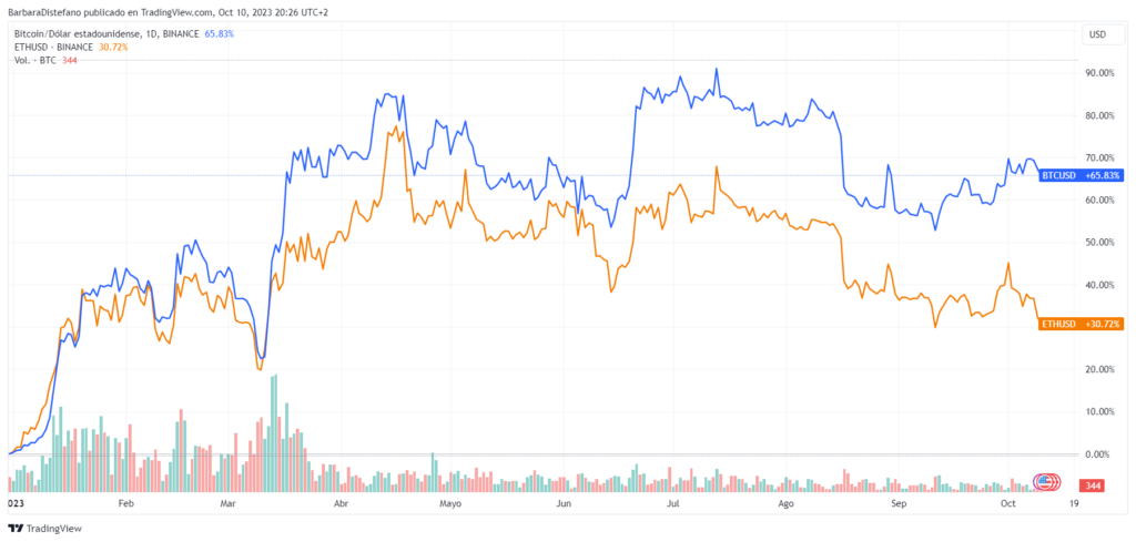 La disparidad de comportamiento entre las ballenas bitcoin y Ethereum explica en parte los diferentes comportamientos de precios que han tenido las dos monedas de mayor capitalización durante 2023.