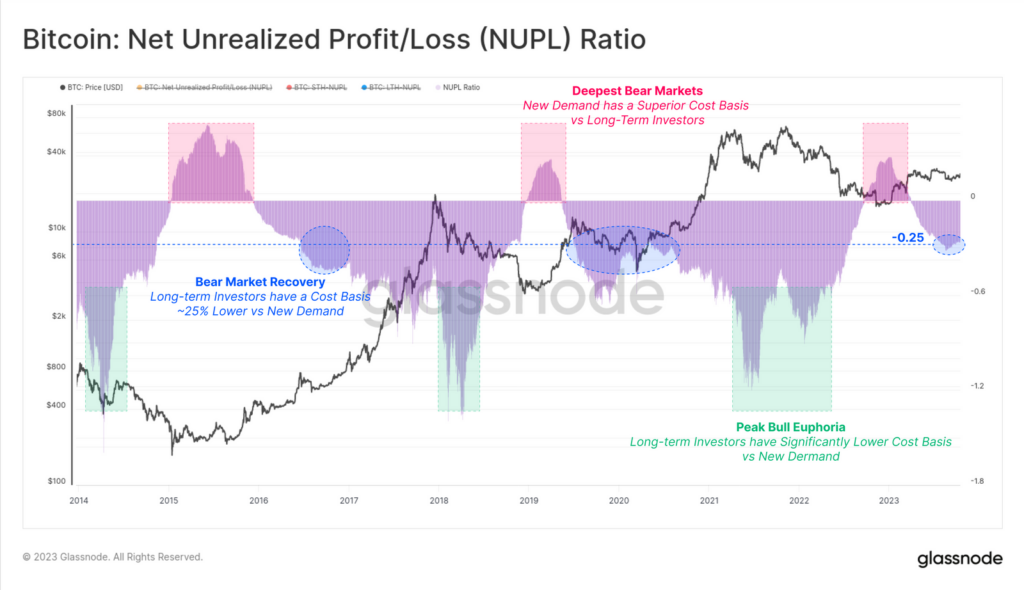 Además, en este momento, el precio promedio de compra de bitcoins de los inversores a largo plazo es un 25% más bajo que la nueva demanda. Glassnode sostiene que esto es característico de la recuperación del mercado, como en los dos años mencionados, después de la profundidad del mercado bajista, en el que prevaleció una base de costes significativamente mayor entre los nuevos tenedores.