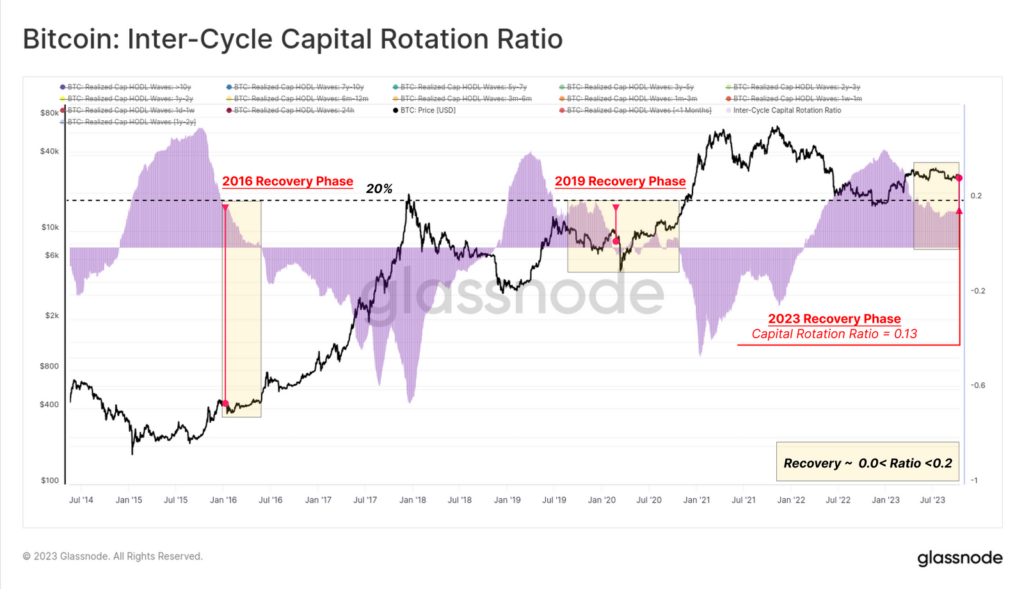 Esto se puede ver a través del índice de rotación de capital entre ciclos, que mide la diferencia entre los bitcoins que se movieron por última vez hace 1 o 2 años y hace menos de un mes. Actualmente esta métrica se encuentra en el 13%, como muestra el siguiente gráfico. Esto también es similar a los niveles observados en 2016 y 2019.