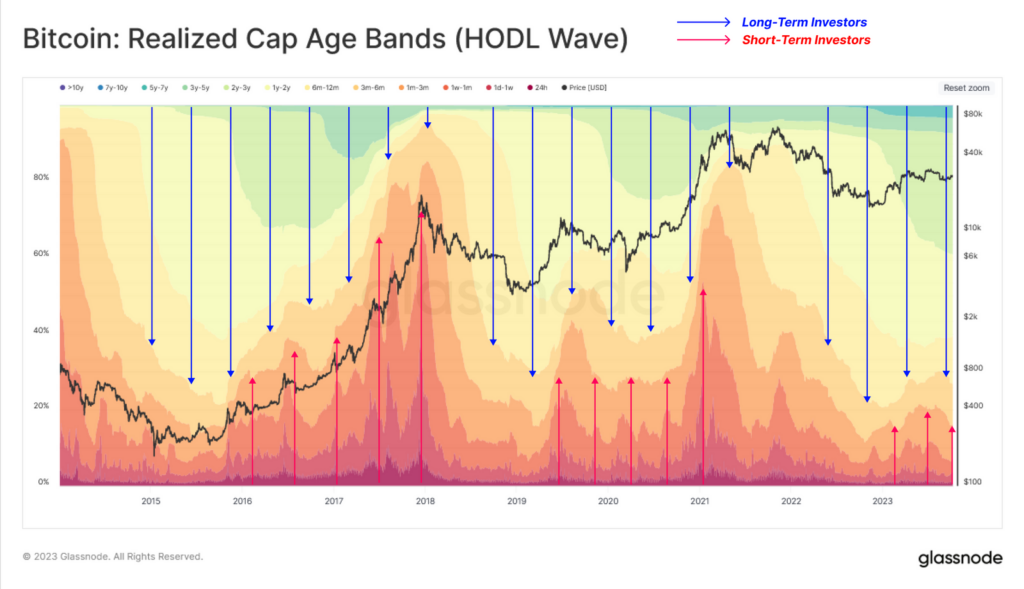 nodo de vidrio Explicar que, durante las tendencias alcistas del mercado, bitcoins Los fondos más antiguos se gastan y transfieren de inversores a largo plazo a otros más nuevos. En cambio, en los períodos del mercado bajista, los especuladores pierden interés y gradualmente transfieren monedas a tenedores a largo plazo.