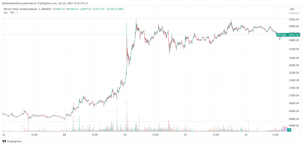Desde entonces, BTC se ha mantenido mayormente cotizando alrededor de $34,000, cerca de su nueva resistencia de $35,000-36,000.
