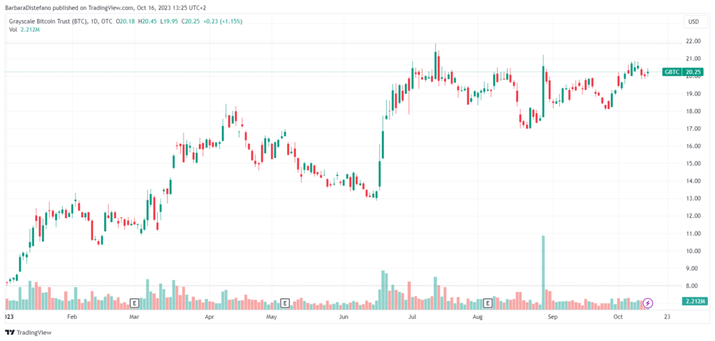 En medio de esto, el precio del fondo de inversión Grayscale Bitcoin Trust, GBTC, ha experimentado un rendimiento del 150% en lo que va de año. Este desempeño es superior al de BTC, que al mismo tiempo registró una subida del 67%.
