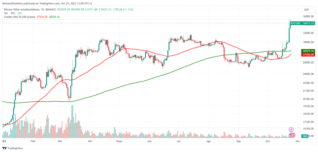 El acercamiento de estos promedios móviles se da luego de que el precio del bitcoin subiera esta semana a 35.000 dólares, su máximo en más de un año.. todo esto antes el entusiasmo del mercado para la posible aprobación de los primeros fondos cotizados (ETF) de BTC spot en los Estados Unidos y que será listado los propuestos por BlackRock y Arca Invertir en el DTCC.