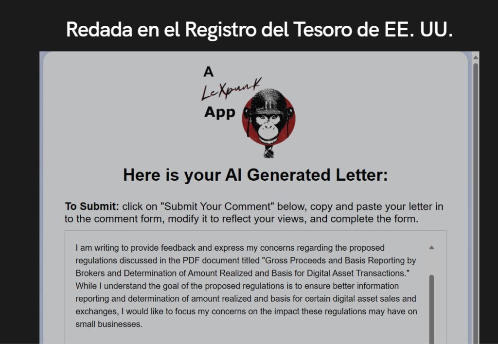 Un grupo que se identifica como “una comunidad de abogados y desarrolladores dedicados a proporcionar recursos legales de código abierto” ha puesto a disposición del ecosistema bitcoin (BTC) y otras criptomonedas, una herramienta de Inteligencia Artificial (IA) que facilita el envío de comentarios en contra de la proyecto de ley que actualmente tramita el Servicio de Impuestos Internos (IRS) de Estados Unidos.