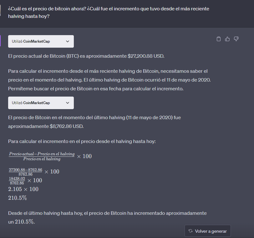 CriptoNoticias experimentó con el complemento CoinMarketCap en ChatGPT4. Le preguntamos “¿Cuál es el precio del bitcoin ahora?” ¿Y cuál fue el aumento desde la más reciente? reducir a la mitad ¿Hasta hoy?” Y esta fue su respuesta: