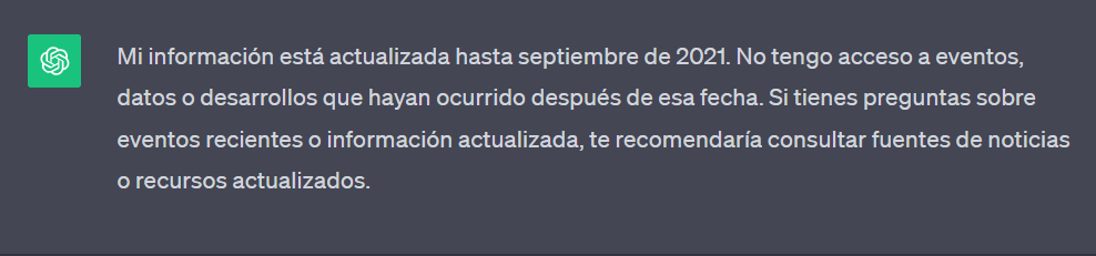 Vale recordar que la versión gratuita de ChatGPT 3.5, Tiene información que llega hasta el año 2021.. Lo que hace que su uso sea limitado, al no responder con datos actuales.