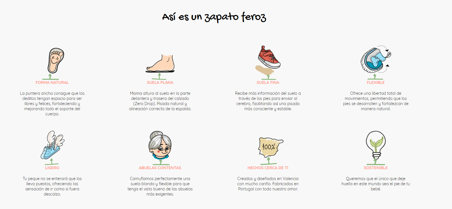 Con la ayuda de expertos pediatras, comenzaron a crear zapatos que respetaban plenamente la fisionomía y evolución del pie del niño, tomando como inspiración de diseño a los propios niños y sus necesidades: modelos prácticos, fáciles de calzar, con apoyo en el empeine y sin elementos que sobreestimulan. El producto destaca por tener una suela fina, dura y flexible, y una puntera ancha que permite el movimiento natural de los dedos, especialmente el dedo gordo. La idea era que los niños pudieran explorar el mundo y sentir “Como caminar descalzoEl eslogan principal de la marca.