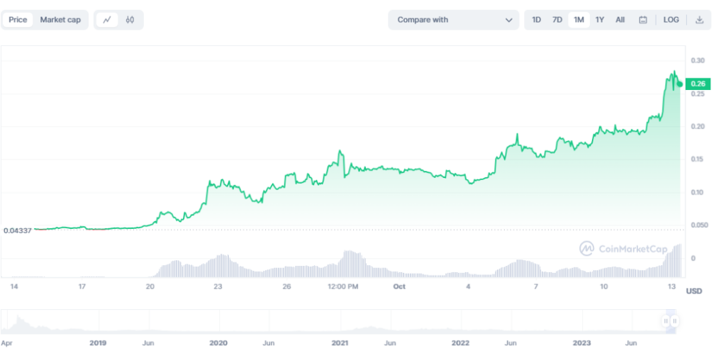 Su precio en ese período pasó de USD 0,043 a USD 0,27 en ese período. Fue un aumento del 513%.como se puede observar en el siguiente gráfico: