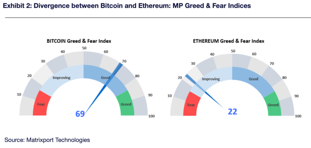 Sin embargo, según su índice de codicia y miedo (codicia y miedo), que se basa en datos que no han sido compartidos, se observa que el sentimiento del mercado de bitcoin es positivo, mientras que el de Ethereum no lo es.