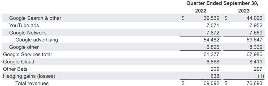 Buenas noticias para Alfabetola matriz de Google, que en su presentación de resultados correspondiente al tercer trimestre de 2023 ha anunciado un 11% de aumento interanual en los ingresosque pasó de 69.062 M$ (T3 2022) a 76.693 M$ (unos 72.400 millones de euros). Anuncios en el buscador de Google Continúan siendo la principal fuente de generación de ingresos de la compañía, con 44.026 millones de dólares, un 11,35% más que en el mismo periodo del año anterior.