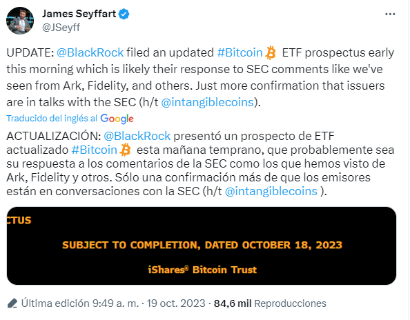 También BlackRock, la mayor empresa de gestión de activos del mundo, habría presentado un cambio en su solicitud ETF lugar de bitcoinde acuerdo a reportado hoy por el analista de Bloomberg Intelligence James Seyffart. Seyffart comentó que esto es sólo “una confirmación más de que los emisores [de ETF] “Están en conversaciones con la SEC”.