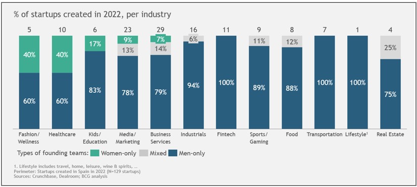 Porcentaje de startups fundadas por hombres, mujeres y mixtas en 2022, según industria. Fuente: BGC.