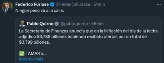 En un día clave para las finanzas públicas, el Secretario de Finanzas, Pablo QuirnoConfirme que en la extraordinaria licitación de este Mircoles otorgó el Tesoro $ 3,788 mil millones de un total de ofertas por $ 3,799 mil millones.