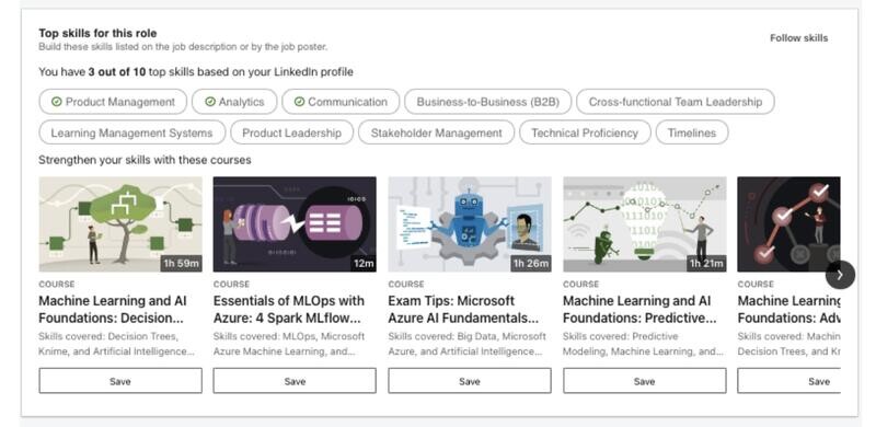 Para ayudar a los usuarios a mantener sus conocimientos actualizados para que puedan sobresalir en su próximo trabajo, LinkedIn Learning mostrará cursos de aprendizaje y ofertas de certificados profesionales cada vez que se establece una alerta de empleo o cuando se explora una oferta de trabajo.