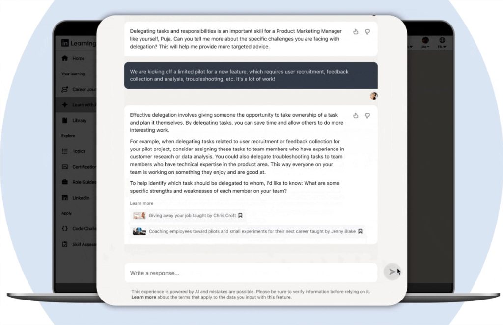 En este sentido, los estudiantes podrán acceder a LinkedIn Learning y hacer una pregunta o explicar un desafío a qué se enfrentan y Entrenamiento impulsado por IA, cuyo conocimiento se basa en la extensa biblioteca de LinkedIn Learning, ofrecerá consejos, ejemplos y comentarios personalizado adaptándose a las habilidades, objetivos laborales y profesionales de cada alumno.