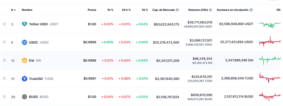 USD Tether (USDT), USD Coin (USDC), DAI (DAI) y otros activos similares, Son algunas de las stablecoins más utilizadas en los países, incluso por encima del bitcoin y otras criptomonedas. Es decir, los dos primeros son los que tienen mayor capitalización de mercadosegún cifras de CoinMarketCap.